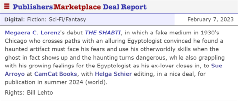 Publishers Marketplace Deal Report for my debut novel, THE SHABTI (coming 2024 from CamCat Books).